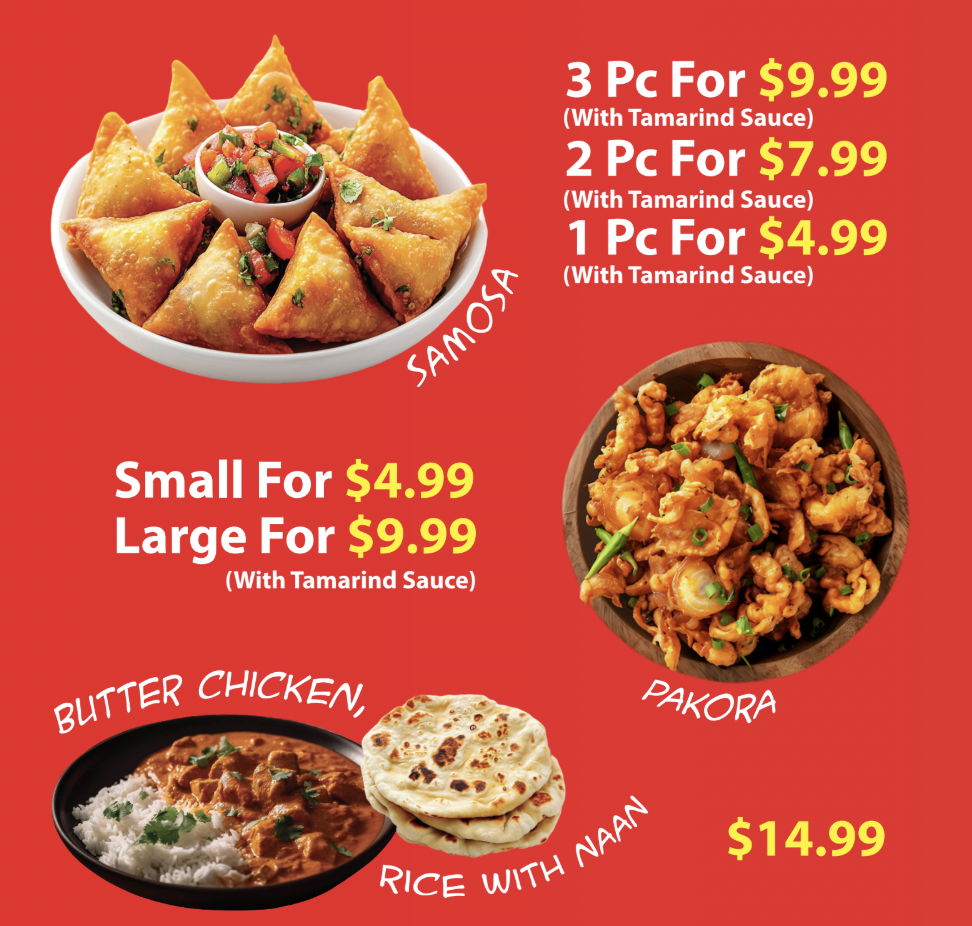 Our Samosas, Pakora, Butter Chicken and Naan are also available at the Prince George Farmers Market every Saturday starting in May and ending in October**